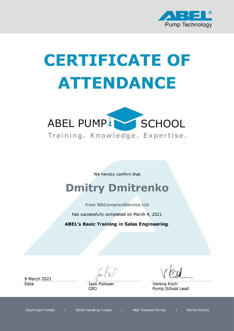 Обучение сотрудников ООО "СибКомплектСервис" проводилось в четыре этапа, и включало в себя углубленное изучение устройства насосного оборудования производимого компанией ABEL, возможности его применения в различных отраслях промышленности, а также преимуществ и недостатков в сравнении с оборудованием производимым конкурирующими компаниями.