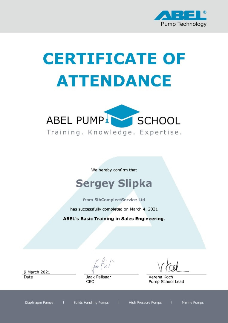 Обучение сотрудников ООО "СибКомплектСервис" проводилось в четыре этапа, и включало в себя углубленное изучение устройства насосного оборудования производимого компанией ABEL, возможности его применения в различных отраслях промышленности, а также преимуществ и недостатков в сравнении с оборудованием производимым конкурирующими компаниями.